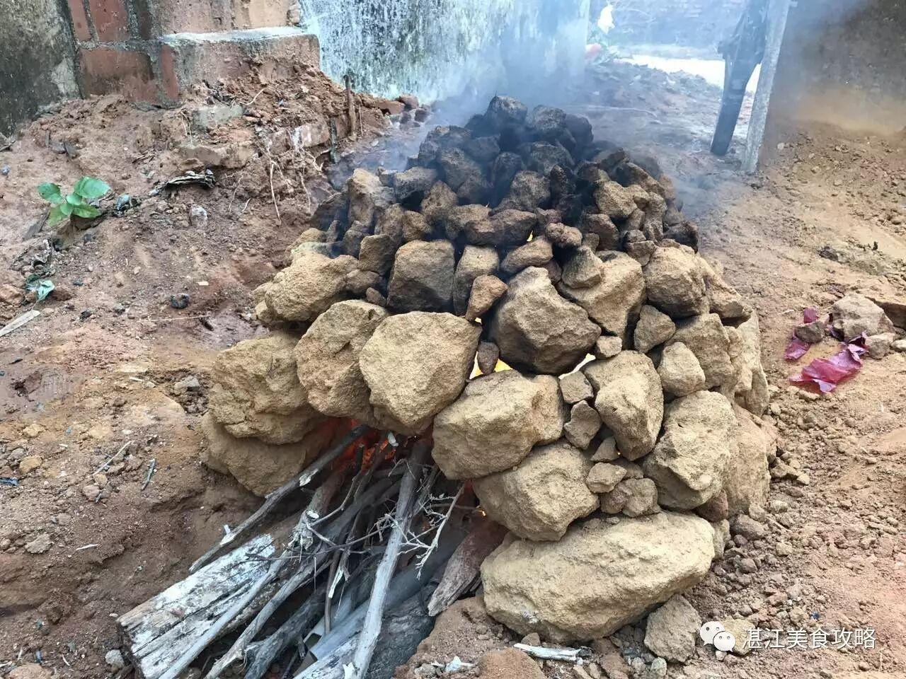鸡瓮绝对是湛江本地一种极具特色的食鸡方式。它的制作过程是这样的:先准备好鸡,把鸡杀了并洗干净,腌制好,裹一层荷叶,裹一层锡纸,最后用一层黄土包严实。接着,用土块垒成洞状,如上图所示,从洞口放入柴火,烧得土块火热发红,然后把火灭了,再把收拾好的鸡放入洞内,把土洞推倒并打碎,使泥块完全覆盖住鸡,借着土块的热量把鸡焖熟。约30分钟后,用棍小心拨开泥块,把鸡拿出来,就可以享用了。鸡带着荷叶特有的香味,皮嫩肉滑,吃起来齿颊留香,不是一般地美味啊,对,不用刀切,撕着吃,大快朵颐。