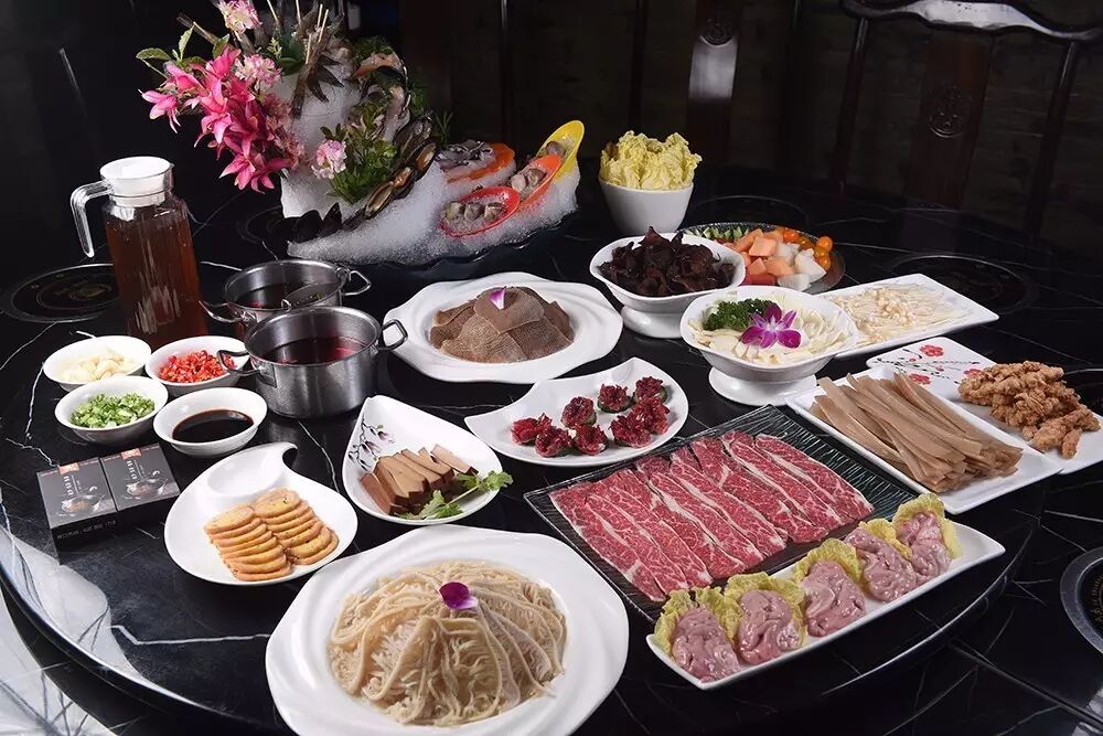 海鲜拼盘;雪龙肥牛;毛肚;千层肚;牛黄喉;姚氏酥肉;猪脑;鸭胗;鸭血;金针菇;黑木耳;娃娃菜;宽粉;凉茶;蘸料(4份);纸巾;水果拼盘;小碟一荤一素;锅底(任选4个)