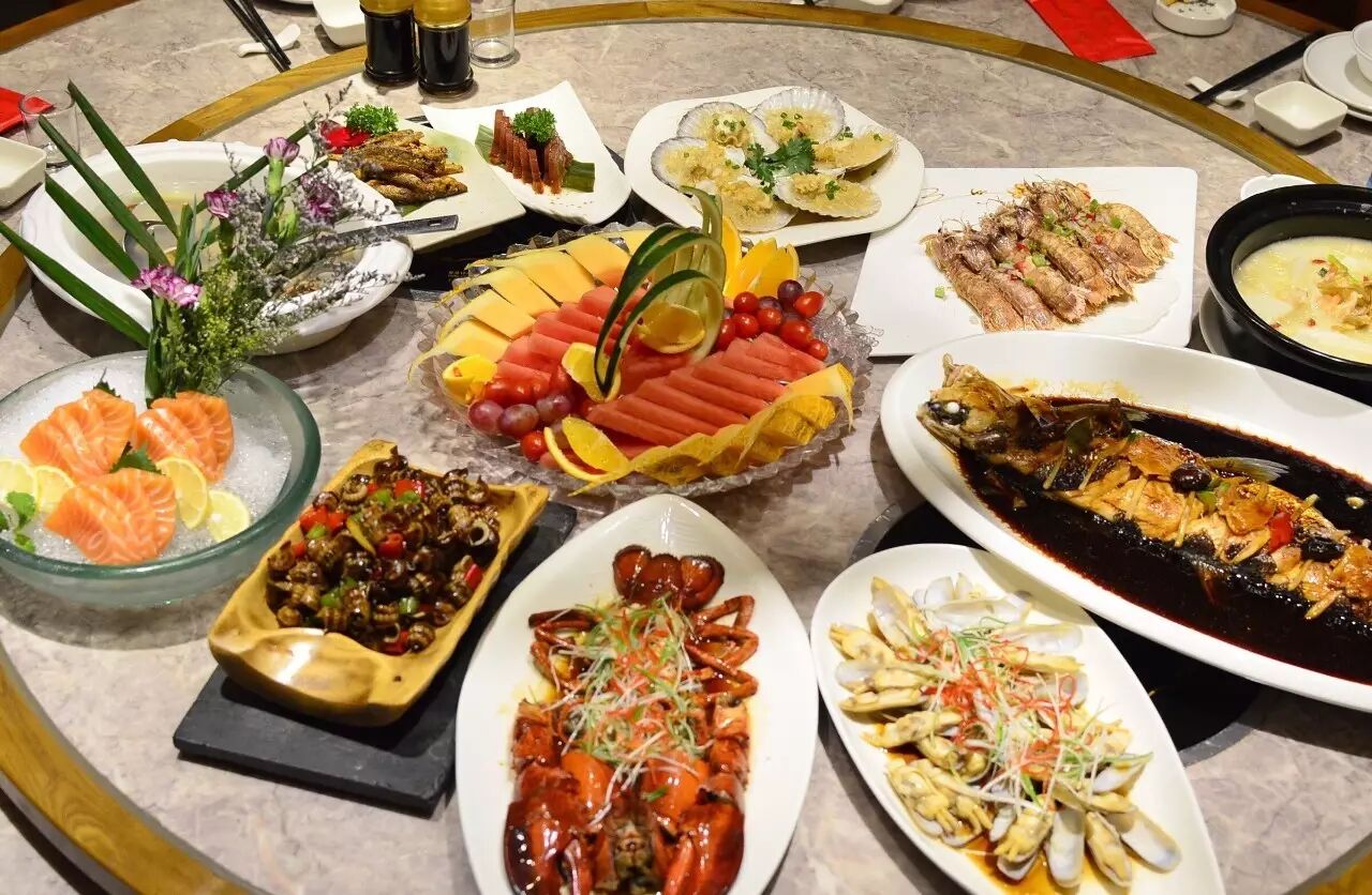 蒜蓉蒸大波龙1000g、花蟹500g 、清蒸龙胆、综合刺身拼(三文鱼 赤贝 牡丹虾 沙丁鱼 八爪鱼)、蛏干羊肚汤、椒盐老蛏500g 、南乳小排、黄蛤500g、文蛤炖蛋、蓝莓山药、葱油木耳、花螺苦螺各250g 、八爪鱼750g、虾菇500g 、百香果汁、连江鱼饺、清炒时蔬