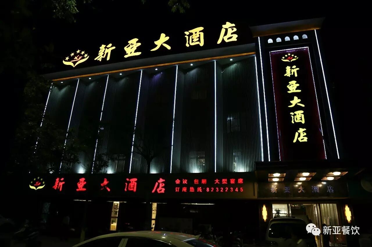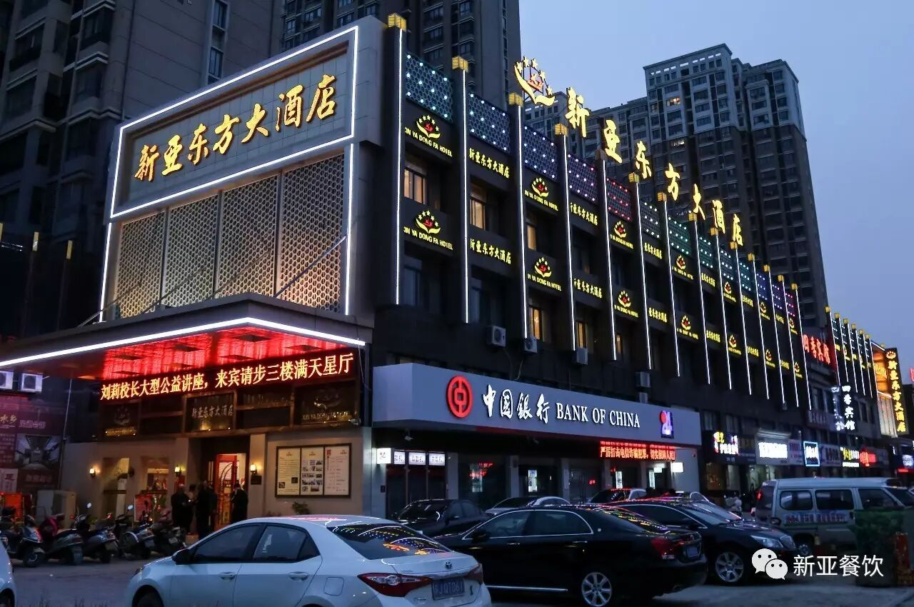 新亚大酒始建于2010年,柒年来,已形成“以服务换口碑、以美味博赞美、以忠诚建团队、以勤俭圆梦想”的新亚精神、“微笑、整洁、新鲜、实惠、美味”的经营理念、4D食品卫生现场管理模式和新亚自身的文化特色。打造成自己的管理团队、厨师团队和服务团队。2015年建成新亚·东方大酒店(清华园小区东首)。目前,酒店拥有50桌和30桌无立柱大厅3个,并配有多套高品质舞台灯光、航架灯光、音响和LED大屏;8至20桌厅12个,各式包厢30多个,单店可接待1000多人同时就餐。