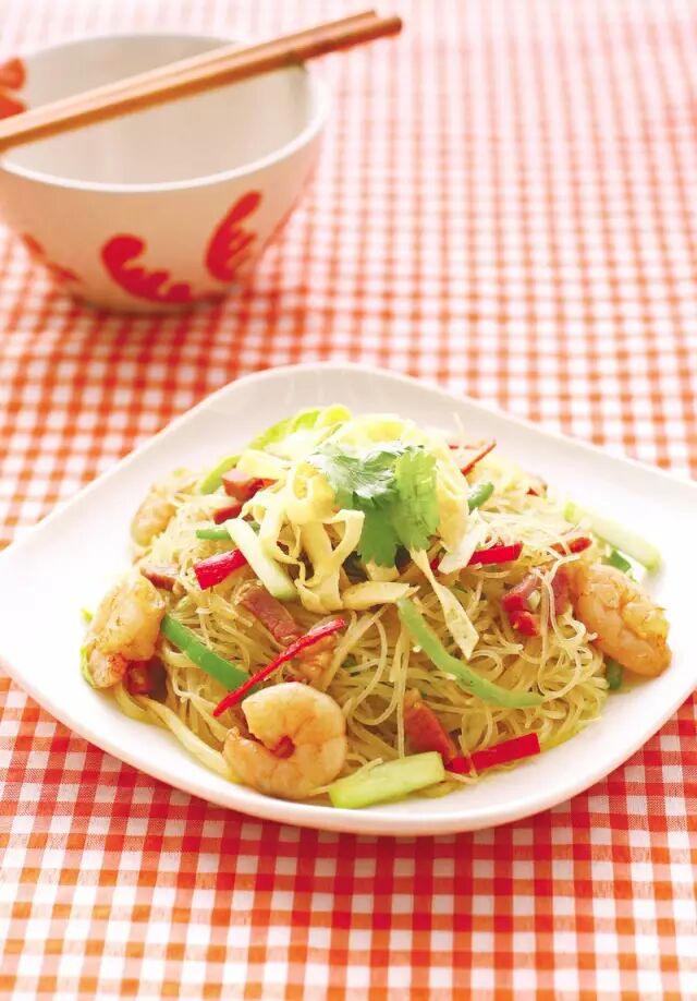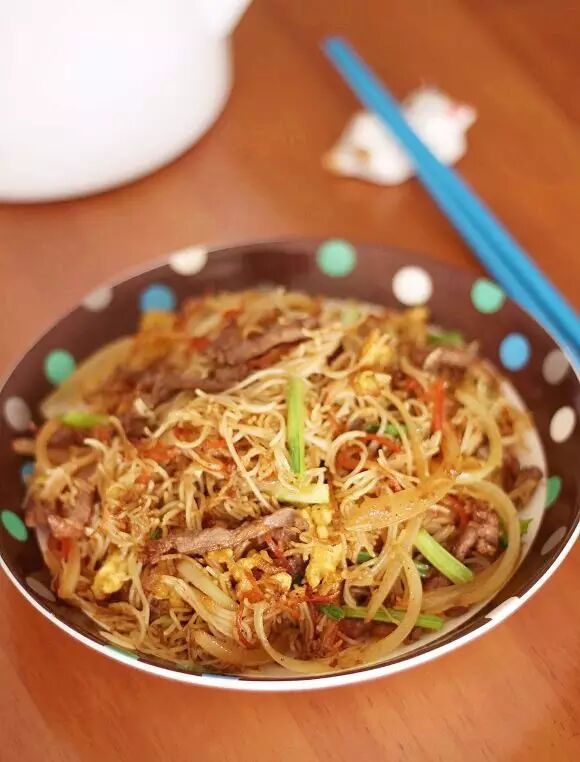干米粉、五香粉、胡椒粉、肉丝、干香菇、青椒、胡萝卜、韭黄、虾仁、鸡蛋、耗油、生抽、老抽、盐、糖、料酒、洋葱。