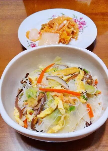 米粉1包约220克、干香菇小6朵、虾米1/2个手掌、红萝卜1/2根、新鲜黑木耳1朵、高丽菜1/4颗、蛋2颗、葱3支、蒜头2瓣、水、肉臊、白胡椒粉、盐、鸡汤适量、香油、酱油、米酒适量。