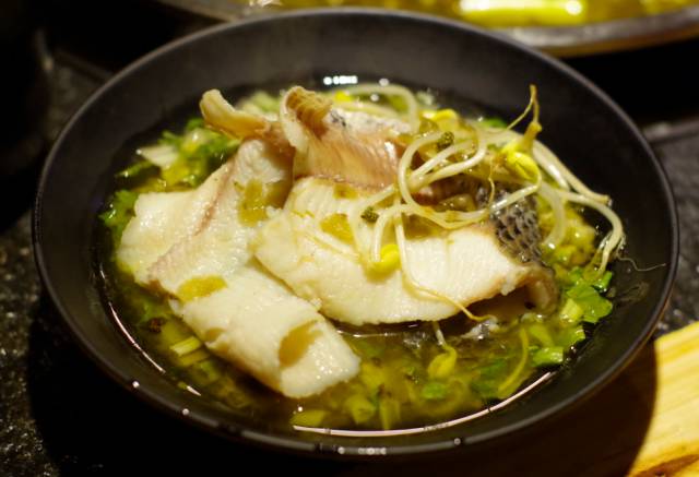 酱香麻辣的口感类似于成都大街小巷的火锅底料,但是吃完并没有红锅的那种燥热感。鱼片在里面涮两下,煮出来非常油润嫩滑。