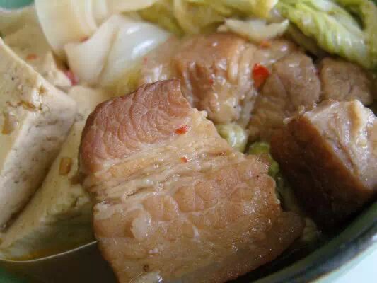 炖猪肉是阳西一道名菜,阳西炖猪肉早在二百年前已在地方流行,历代人才辈出,现在仍许多人精通制作方法。炖猪肉最好是选用饲养一二年的猪选用猪的脯肉(俗称五层楼),将肉放汤中煮熟,然后切成二寸见方的块块。放上陈皮、桂枝、老抽、精盐、蒜、豉油、香粉、姜等配料,腌十分钟,再放镬中用花生油略炒,然后兜起慢火炖煮,煮过程中放酒放糖,猪肉软熟即熄火。这其中有两点是关键,一是配料多少,二是炖肉火候。二者要恰到好处,否则影响味道。有关炖肉制作阳西有很多名手,他们各有秘诀,轻易不向人外传。好的炖肉硬皮软囊,入口醇香,引人垂涎,要艺高者才能制作。