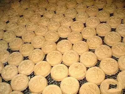 又名米饼,原料是用大米爆炒,磨成粉末,放糖胶和鸡蛋拌匀,用印印好,在米筛上用炭火烘熟即成。新成的阳西粉酥又甜又脆,香味浓郁,是阳西人的传统食品。过去有很多的粉酥制作作坊,在地方上小有名气,粉酥制品经年不缺。粉酥制作虽然简单,但各家口味相差甚远,配料是主要关口。现阳江阳西仍有不少粉酥制作厂场,各自保存着配料秘方。