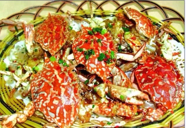 蟹,青蟹,肉蟹,膏蟹,血蟹。阳西地区以沙扒镇产的较为出名。还有花蟹、红蟹,尖山蟹等。常见食法有姜葱焗、炊、灼、盐焗等。膏蟹饭与花蟹粥均为阳江一大特色。