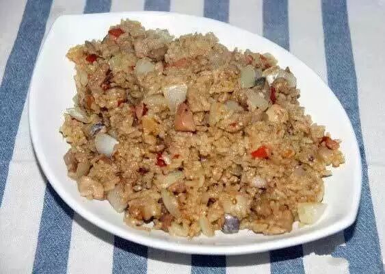 马鲛鱼鲜甜肉滑,清香可口,营养丰富,味道鲜美。马鲛鱼饭的制作,要用1至3斤重量的马鲛鱼,大了不好吃,少于1斤也不好吃。马鲛鱼要鲜活,先把马鲛鱼切像小方糖那样大小的鱼粒(不要骨头),配上同样大小的瘦猪肉粒,也可放少量的腊肠腊肉。切好鱼肉猪肉后,先下锅猛火炒至六七成熟,炒时要下重猪油,放些辣椒末、少许姜末、葱、蒜、酱、油、洒、糖,起锅后用盆起来,然后洗锅煮饭,最好是炒米饭,半炒半煮,饭有七八成熟之后,将炒好的鱼、猪肉放入,煮几分钟,熟了,再放入炒熟的花生油、洋葱等拌均,便成了香喷喷热腾腾的马鲛鱼饭。它的风味独特,是渔家接待贵客席上的最高礼遇。