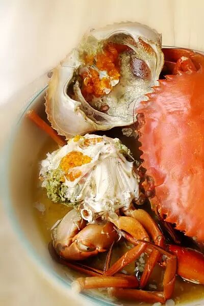 潮汕人最爱吃浅海处或处于浅水与咸水之间的青蟹,尤其是受精蓄子的母蟹,因为它膏腴满腹,蒸熟之后蟹膏红亮如金,极其甘美。
