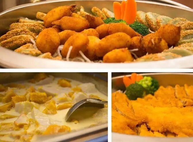 热 盘:新加坡黑椒炒蟹、姜葱炒圣子、蒜茸蒸元贝、香煎沙尖鱼、烧汁烧秋刀鱼、豆椒炒花甲、西班牙照烧牙带鱼、泰式串烧咖喱虾、盐焗海螺、海鲜黑椒炒意粉、日式三文鱼炒饭、鸡汤浸娃娃菜