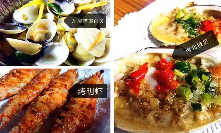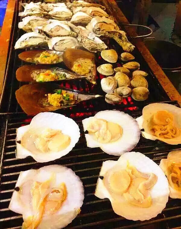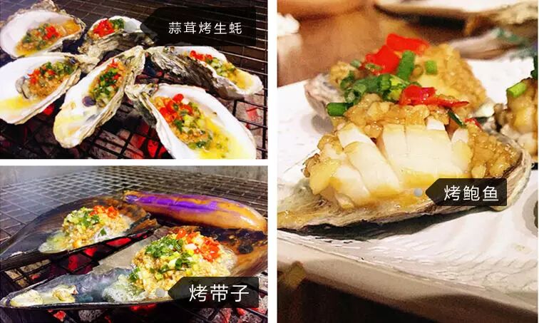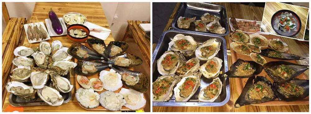 ①蒜茸烤生蚝1打 ②明虾5只 ③带子5只 ④元贝5只 ⑤白贝1份 ⑥花蚬1份 ⑦杂菇1份 ⑧茄子1个 ⑨鸡中翅1份