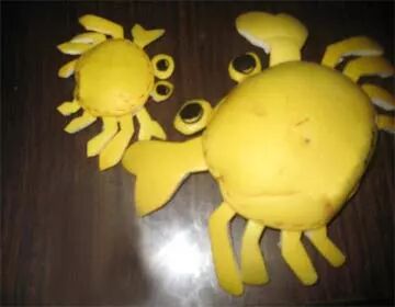 用柚子皮做的螃蟹,很有意思,腿是用针线缝上的,眼睛是用笔画上的,你也可以和宝宝一起做哦。