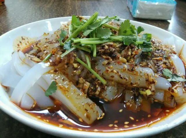 店的门脸不大,里面桌椅挺多,多是卡台。上菜速度非常快。点完餐后洗个手的工夫菜就齐了。凉拌笋丝是咸口的,解辣,但是不够爽口。 银丝蛏子,这道菜比较辣,银丝就是粉丝,粉丝比海鲜辣,海鲜比较新鲜,没有一点沙子。 鸡丝凉面,宫保鸡丁,酸梅汤,这三样是每次必点的。吃过的人都说好。