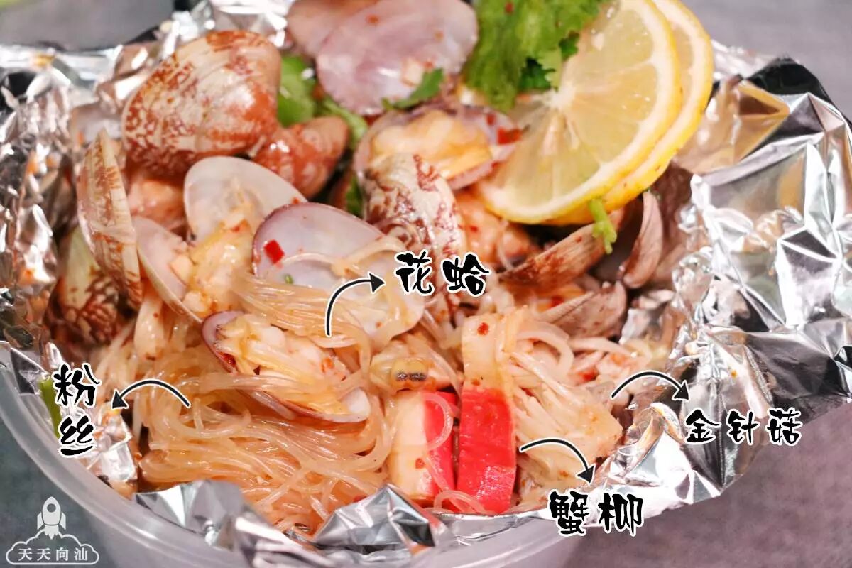 ▲花蛤快要占据花甲粉的一半!而金针菇、蟹柳、粉丝都是吸汁的标配!锡纸也完美保住了花甲粉的味道,到手还是热乎乎的一碗哈!