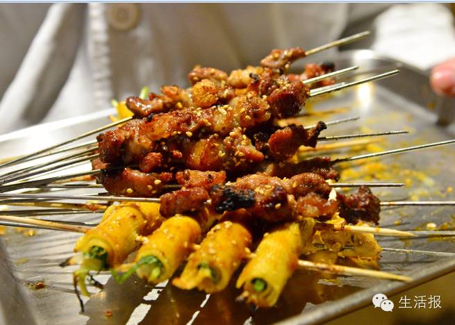 牛肉串、羊肉串、烤鸡心、疙瘩汤