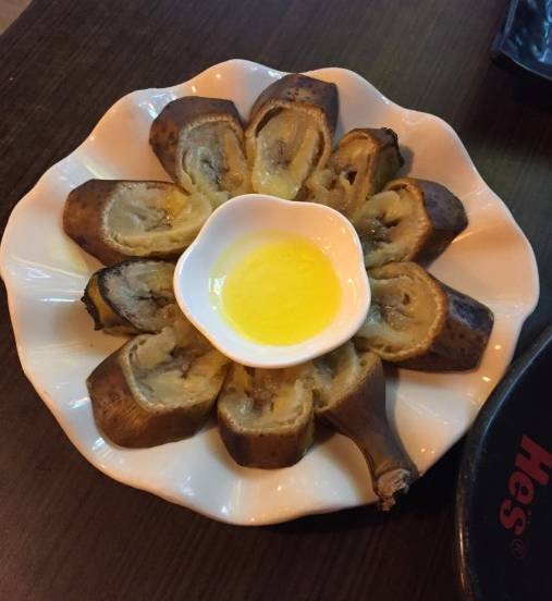 烤香蕉也是一大特色,中间放的是柠檬酱料,味道非常香甜清爽,吃多了辣和油腻的时候就可以来一份。