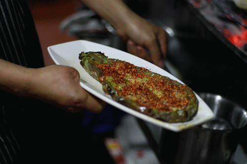 烤好的茄子,简单粗暴撒一把干海椒面儿。最后再淋一瓢熟油。茄子最原版的香味能淋漓尽致的体现出来。这么一个茄子,只要6块钱!!