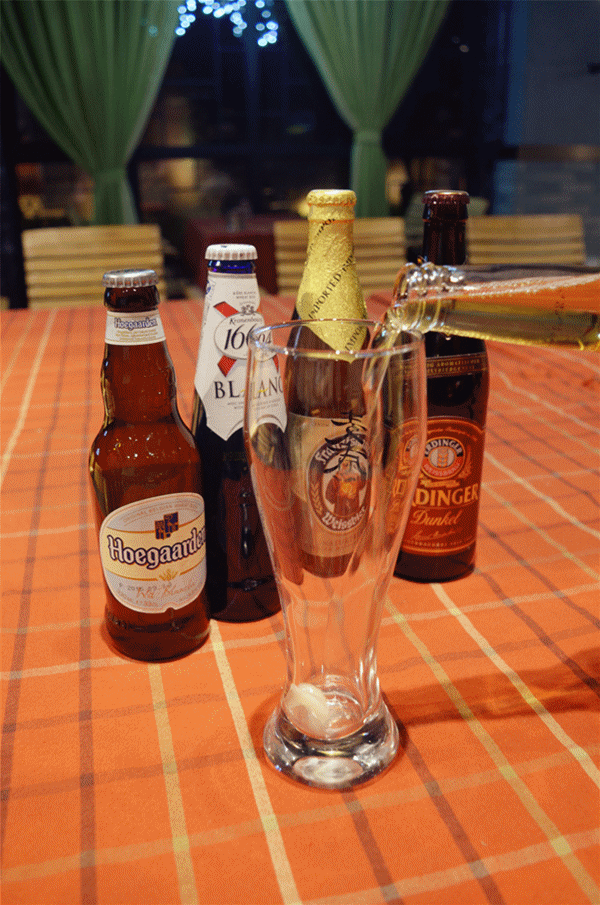 除了各种吃,进门的栏架上还摆满了各种进口啤酒。