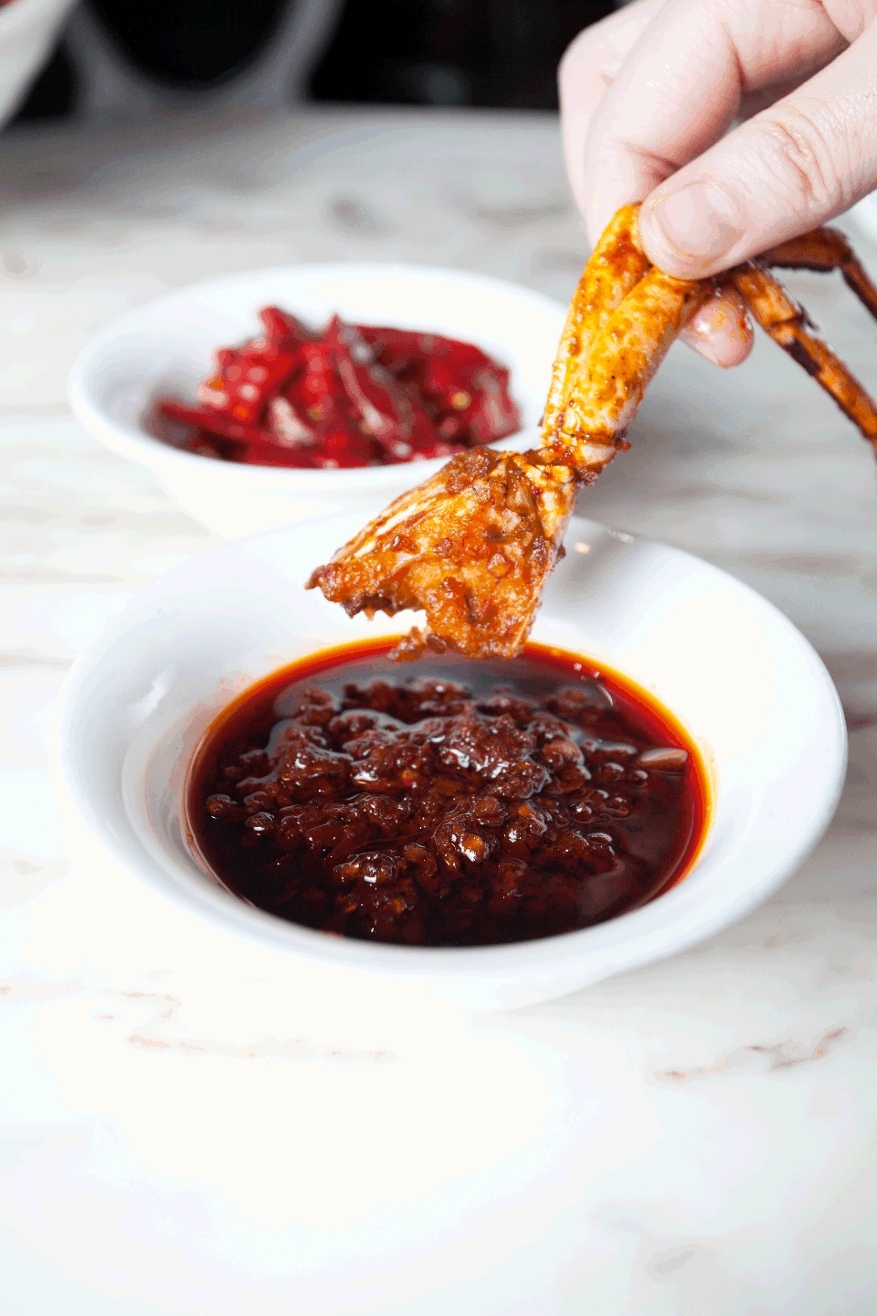此蟹此景怎么可以少了超级无敌四川风味辣椒酱,对,就是那种辣到额头冒汗手心冒汗,整个人都沸腾到发癫的的酱。配上这色似玉,鲜肥丰满的大蟹肉,已达到色香味俱全的巅峰!从舌尖一直冲击到嗓子眼,麻辣到要??。