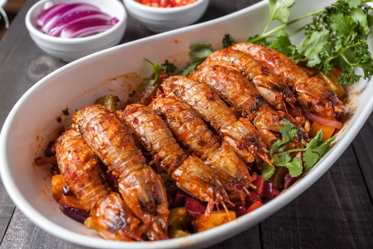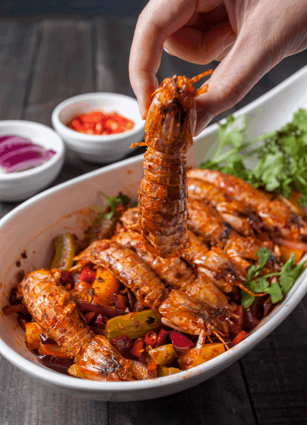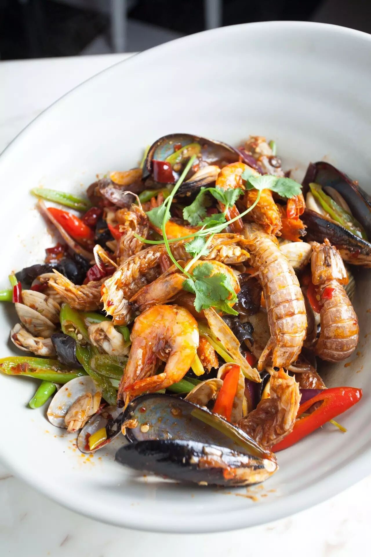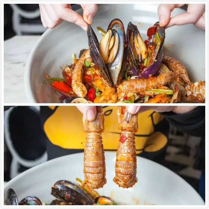 随手捞起两个超巨的小海鲜,据山东小伙伴说“海鲜口感好不好光从色泽的亮度上就能看出来!越亮越新鲜,口感也就越好。浓稠的麻辣酱汁沾满了整个身体!鲜红的辣椒直接附在虾的表面,吞壳的冲动都有了!