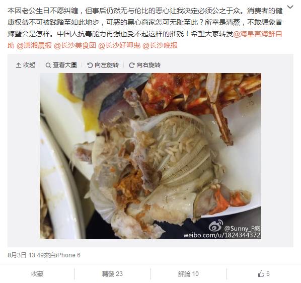 8月3日,@Sunny_F疯 连发3条微博,投诉长沙的海皇宫海鲜自助餐厅提供问题食品。