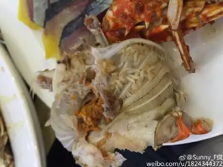 但是!!重点来了,吃饭不到半小时,她老公掰开一个清蒸螃蟹,突然一股恶臭味迎面扑来。“蟹肉上一团密密麻麻的白色物体,我们当时就蒙了。”他们二人仔细辨认之后一致认定:白色物体就是蛆。