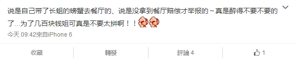 对于厨师李师傅的言行,徐沫解释说,“他是新来的学徒。”她说,有可能是员工工作不仔细,“要是员工出现疏忽,该处罚的处罚。”徐沫觉得,消费者既然选择海皇宫,肯定是对餐厅的信任,徐沫也代表餐厅向消费者致歉。小编觉得,店长的态度其实还是很好的!