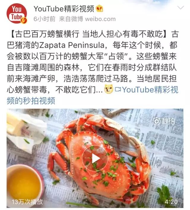 刚被丹麦的生蚝刷完屏,古巴的螃蟹又泛滥了,只能看不能吃的中国“吃货”又开始干着急: