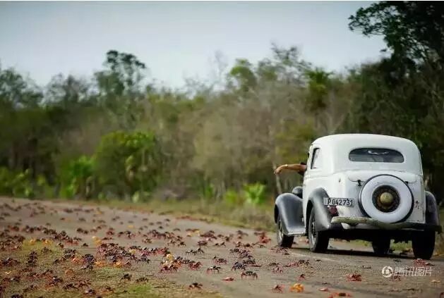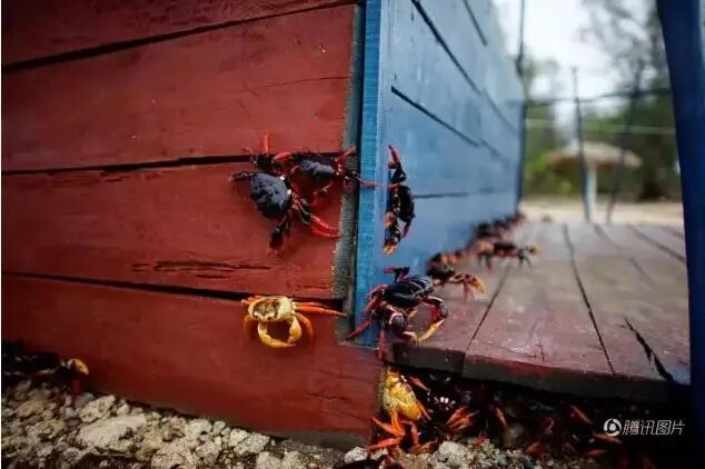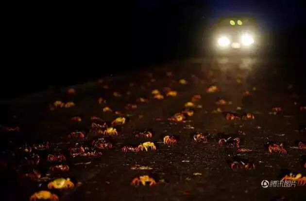 每逢日出日落,这种红黑黄相间的螃蟹便如同百万大军一样,横穿路面。