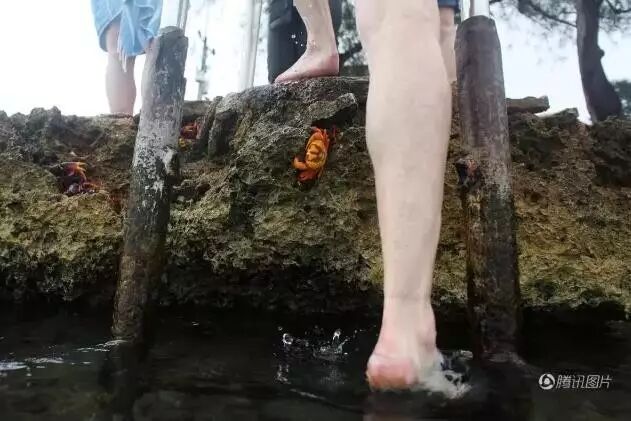 游客从海边上岸时,差点踩到一只扒在岩石上准备产卵的螃蟹。