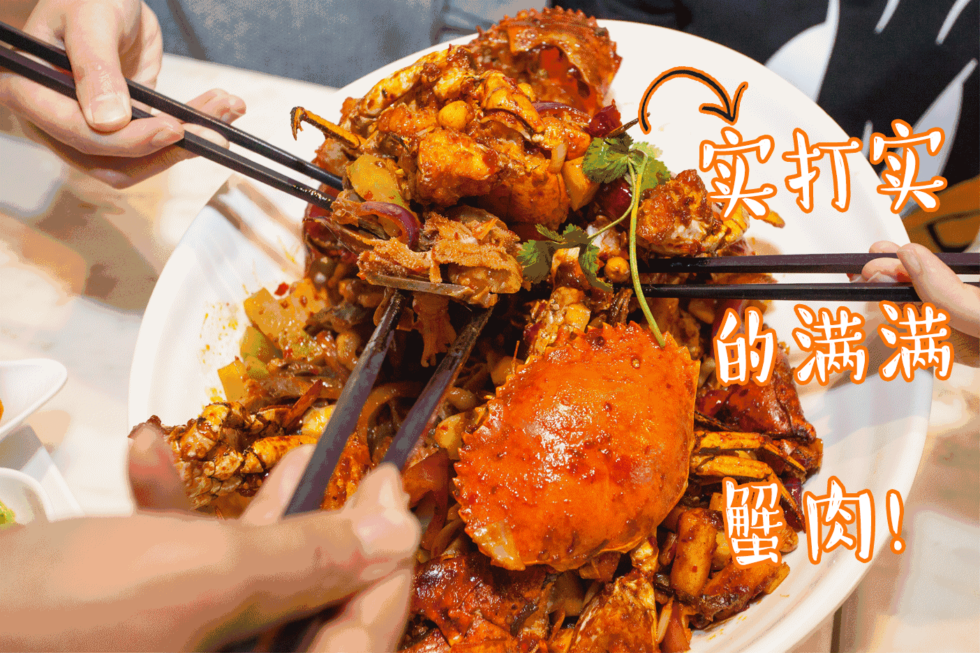 一个翻炒底便能发现巨量蟹肉+配菜,实打实满满的蟹肉啊!~夹一个巨钳和巨腿,在手中就被重得不行,KING OF THE 蟹的称号非他莫属。这样一盆4-6个人绝对管饱哦~