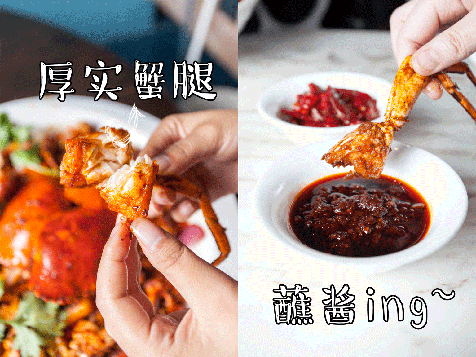 Look!细腻饱满的蟹肉搭配上秘制辣椒酱,瞬间麻辣的口感与蟹汁的鲜美一同蔓延到了舌根!好吃的要飞起来了吼吼吼︿( ̄︶ ̄)︿!