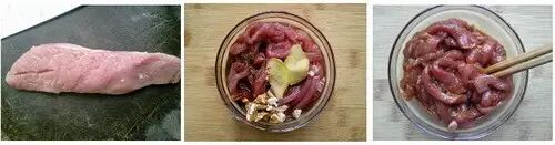 4、瘦肉切丝,加两片姜用生抽、老抽、料酒、香醋和淀粉上浆腌制10分钟。