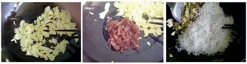 7、迅速炒散鸡蛋,继续放入肉丝,翻炒至肉丝变色,加入米粉。