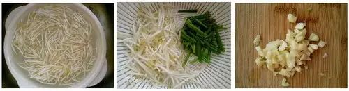 1、豆芽去根洗净沥干水,葱切段,蒜切碎(广东炒米粉最常用的配菜就是豆芽)。