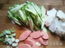 3.杏鲍菇和火腿肠切片,西葫芦切丝,葱切碎