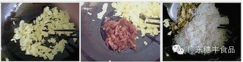 7. 迅速炒散鸡蛋,继续放入肉丝,翻炒至肉丝变色,加入米粉