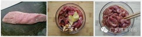 4. 瘦肉切丝,加两片姜用生抽、老抽、料酒、香醋和淀粉上浆腌制10分钟