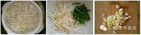 1. 豆芽去根洗净沥干水,葱切段,蒜切碎(广东炒米粉最常用的配菜就是豆芽)