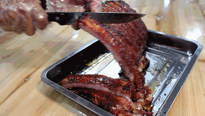 趁着热气赶紧把排骨切开,肉汁与蜂蜜从排骨中流淌下来,肉香浓郁诱人。