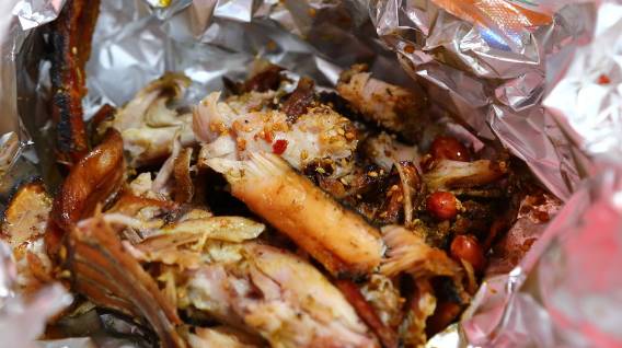永远活跃在苍蝇馆子排行榜上的王妈手撕烤兔,天天都在排队,烤兔是包在锡箔纸里的,肉烤得很干,骨头都酥了!最巴适的是它的调料,有麻辣和五香两种,调料比肉都还好吃!