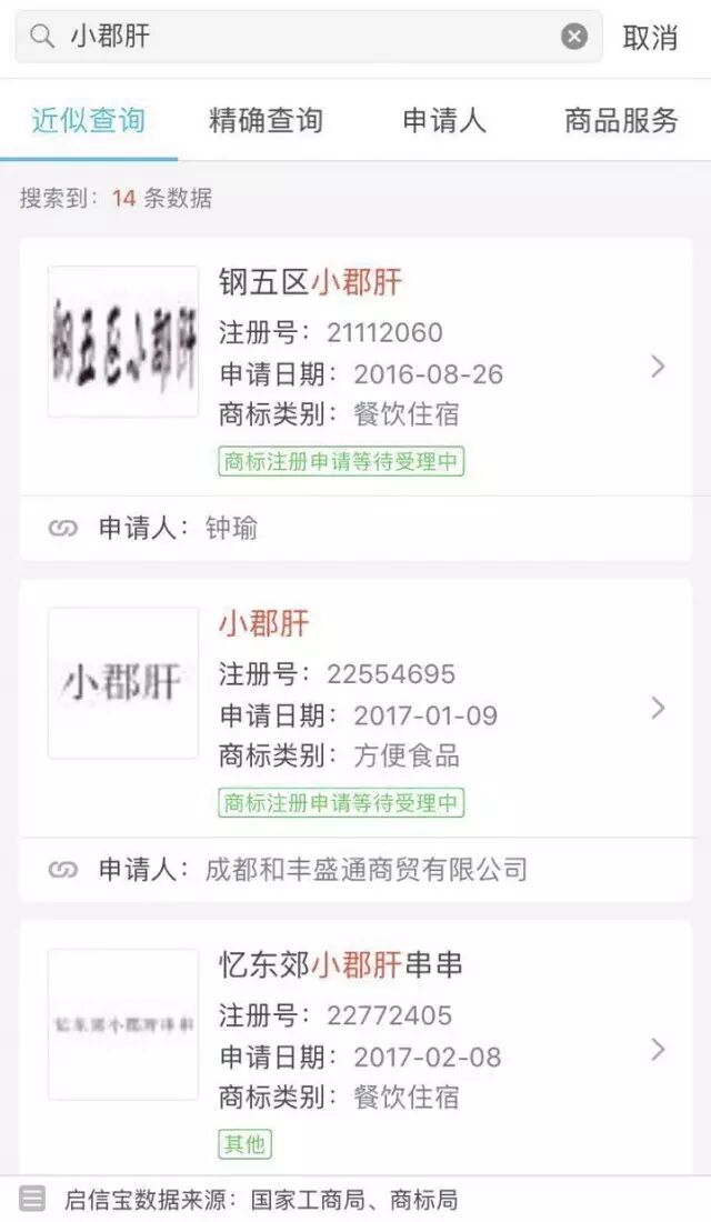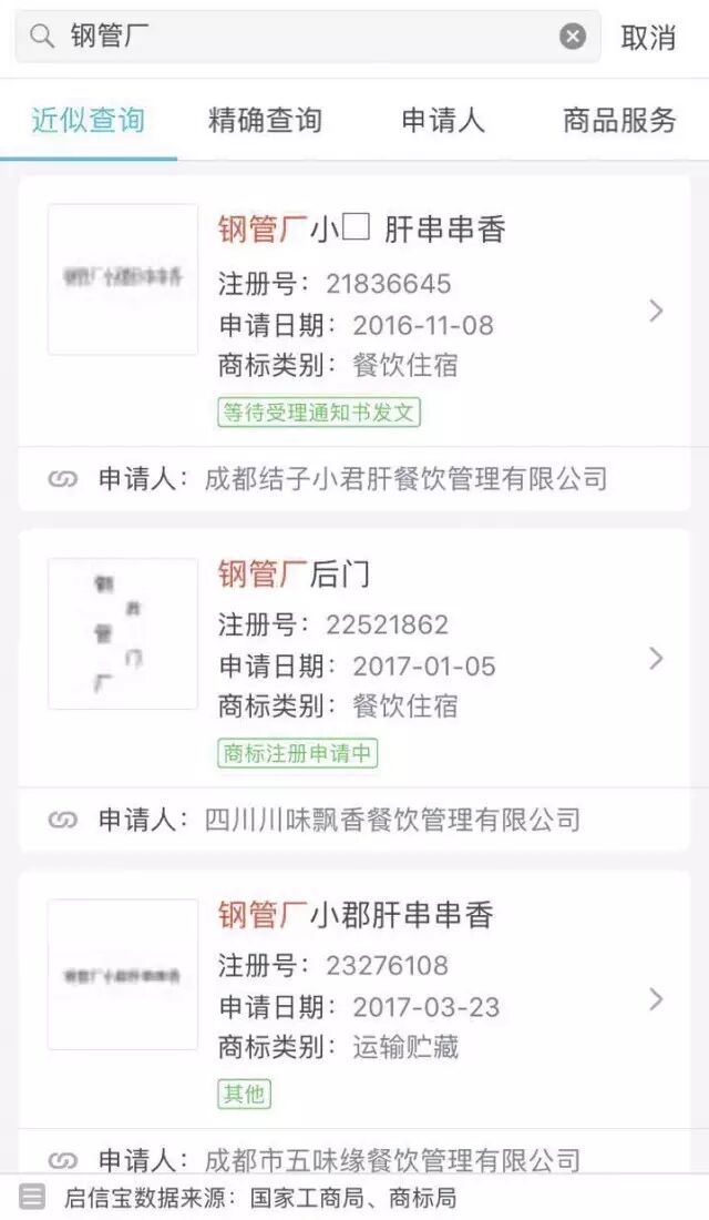 出于好奇,查了下“小珺肝”和“结子”这两个商标,前者并未被成功注册,后者的商标所有权是浙江一个卖瓜子的,而“钢管厂”的商标竞争已经激烈到争夺后门所有权的地步了。突然想起之前广场上经常放的广告“每个人的命运都是天生的,输入你的名字,就能知道你的吉凶祸福,例如乔峰,例如黄蓉”,可见一个好名字是有多重要啊。