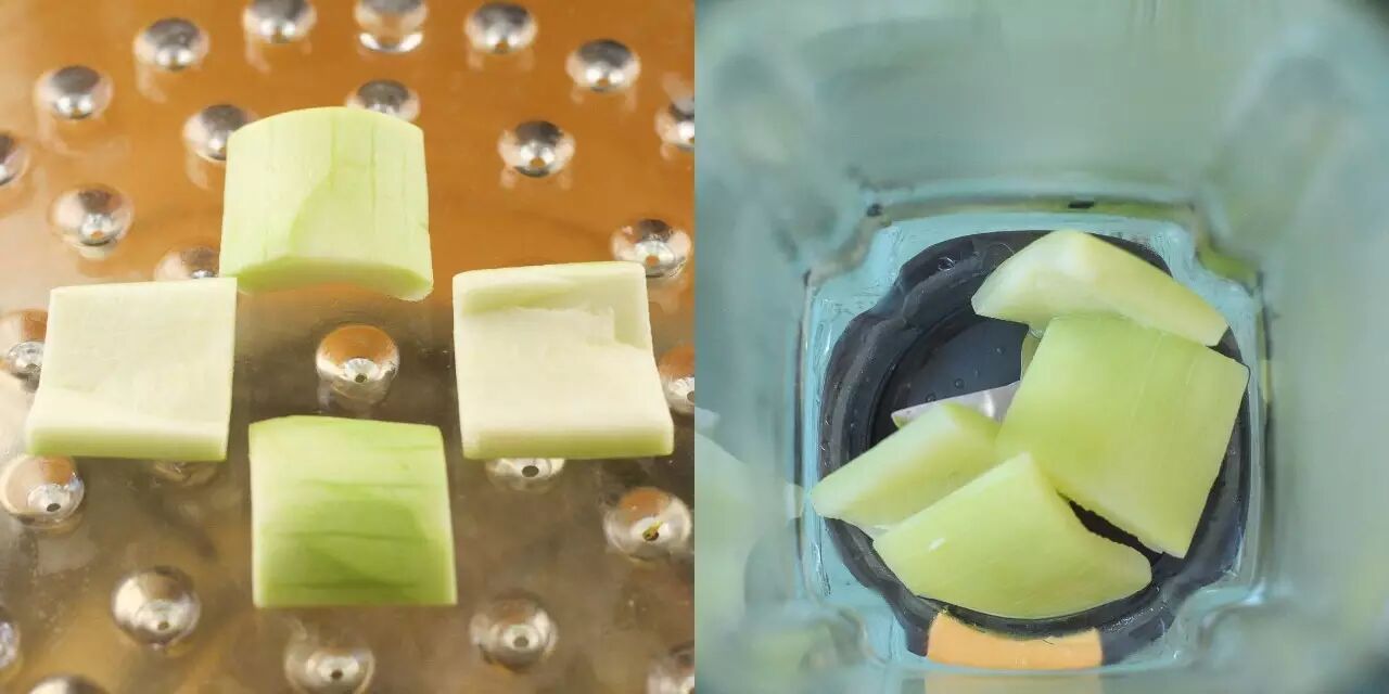 PS: 茭瓜的含水量很高,只需少添加一点温水,保证搅拌机正常运作就可以了。