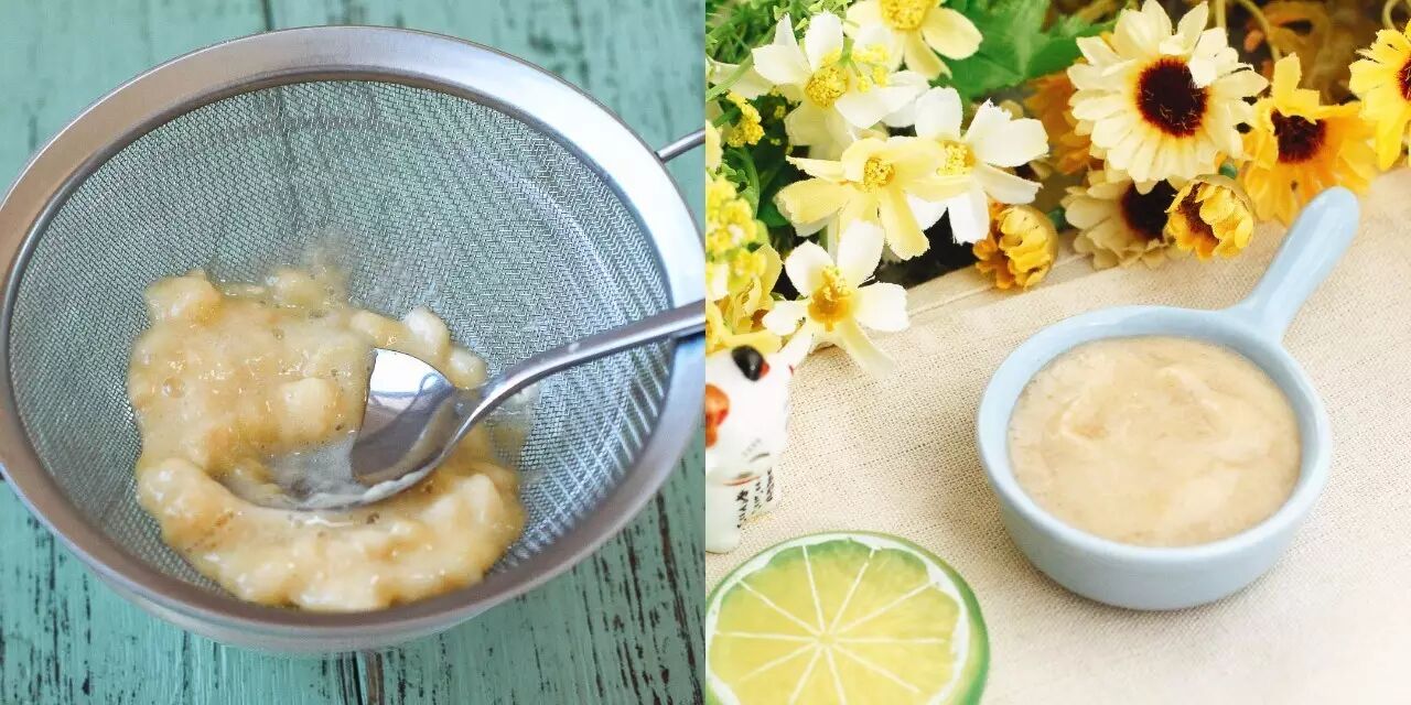 PS:如果仅用研磨碗或者勺子来压泥,可能还会有香蕉果肉存在,所以用筛网再过滤一下,香蕉泥会变得非常细腻。