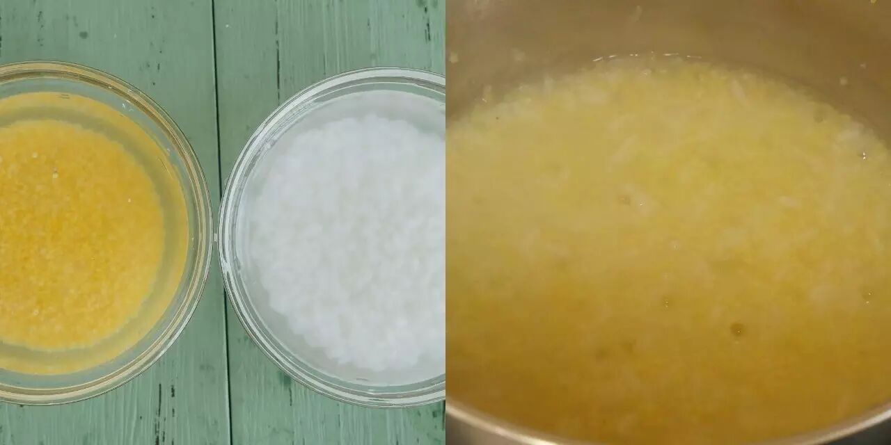 2. 锅内烧水,水开后放入提前泡好的大米小米,熬煮成米粥。