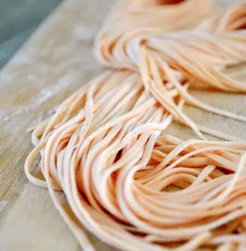 3、 用面条机压出细面条或者用手工擀之,先把面团擀成薄饼状,越薄越好,多擀几次之后,然后撒上面粉将面饼卷起切成面条,越细越好;