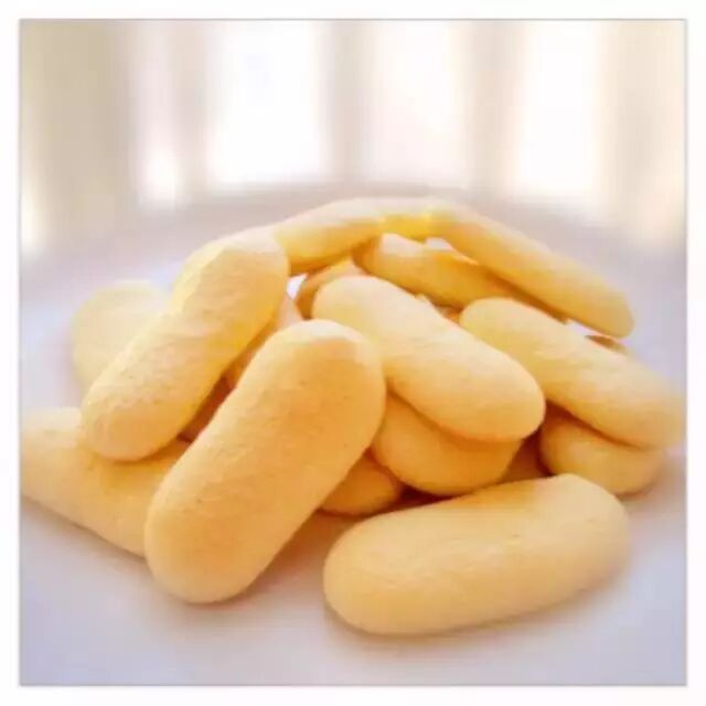 适宜12个月以上宝宝食用材料:2只鸡蛋,一小搓低筋面粉,一小搓玉米淀粉,一点玉米油,因为分量比较小,所以都没有具体称了做法:1、预热烤箱175度;2、分离蛋清蛋黄;3、电动打蛋器打发蛋清到拉出来有小的尖角,即硬性发泡状态;4、蛋黄加入玉米淀粉低筋面粉和玉米油,搅拌均匀;5、蛋白和蛋黄液翻拌均匀;6、装入裱花带,在烤盘上挤出手指的形状;7、上烤箱,中层,10分钟,饼干微微变有点金黄色即可。 可以适当调节面粉多少,从12个月可以一直吃,根据喜好调节软硬程度。