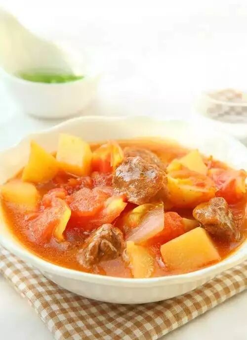 材料:番茄2个,牛肉一块,土豆2个、姜、葱适量做法:1、 自来水中加入少许的盐,然后放入牛肉浸泡1小时后,切成小块;2、 土豆切小块,番茄切小块;3、 将牛肉放入电饭煲中加水炖30分钟;4、 葱、姜爆香,油锅内入番茄和土豆翻炒,然后倒入闷好的牛肉汤中,再熬煮25分钟左右。