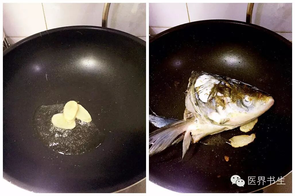 油煎鱼头至双面鱼皮变至微黄色,盛出,将姜葱塞入鱼头备用