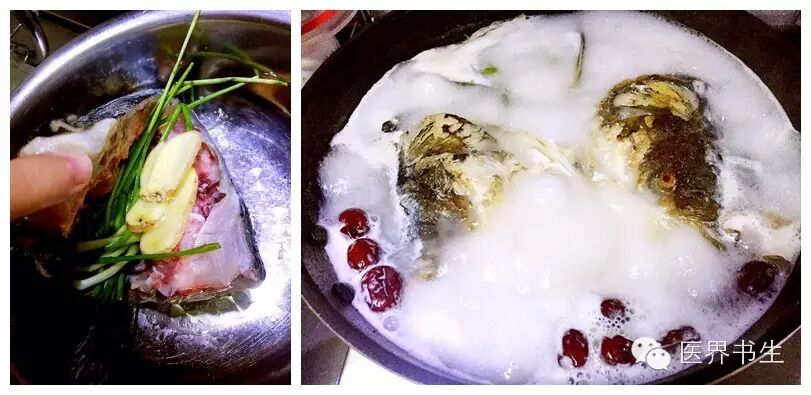 天麻、鱼头入锅,烧沸后,撇去鱼头中的污秽物质产生的浮沫,这样可使鱼汤更加纯白。