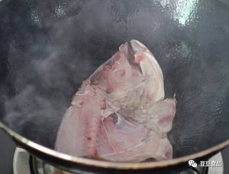 2、起油锅,等油温有一点烟了,放入鱼头;
